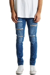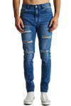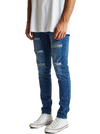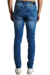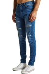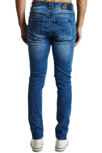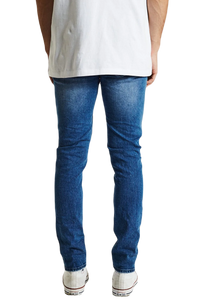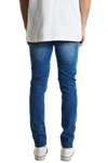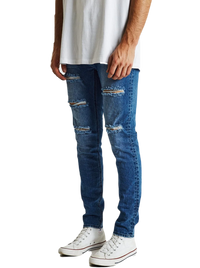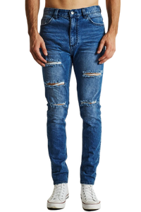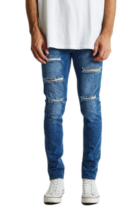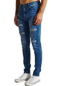 The K1 is a super skinny fit jean by KSCY. Features ripping to knees & thighs, five pocket styling with zip fly.. Constructed with premium stretch demin in a blue wash with a tapered leg for the skinny look.
